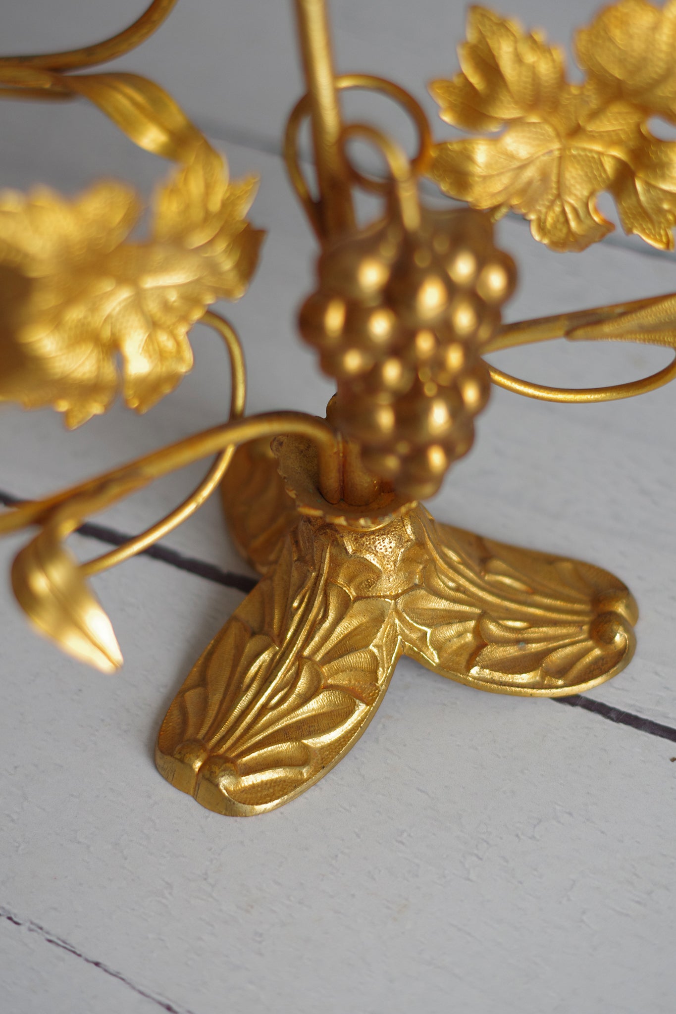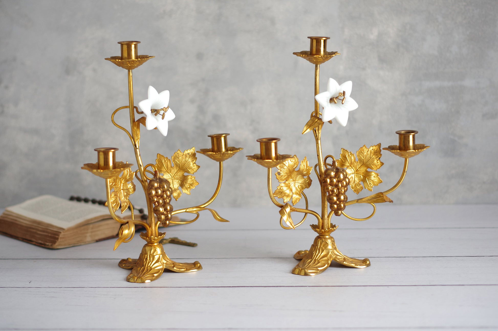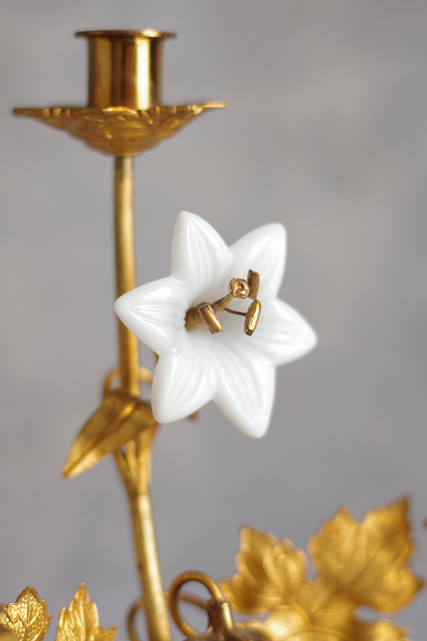 Description: Pair of antique 19th-century church candelabra. The base is bronze, the branches and ornaments are brass with white opaline glass flowers.