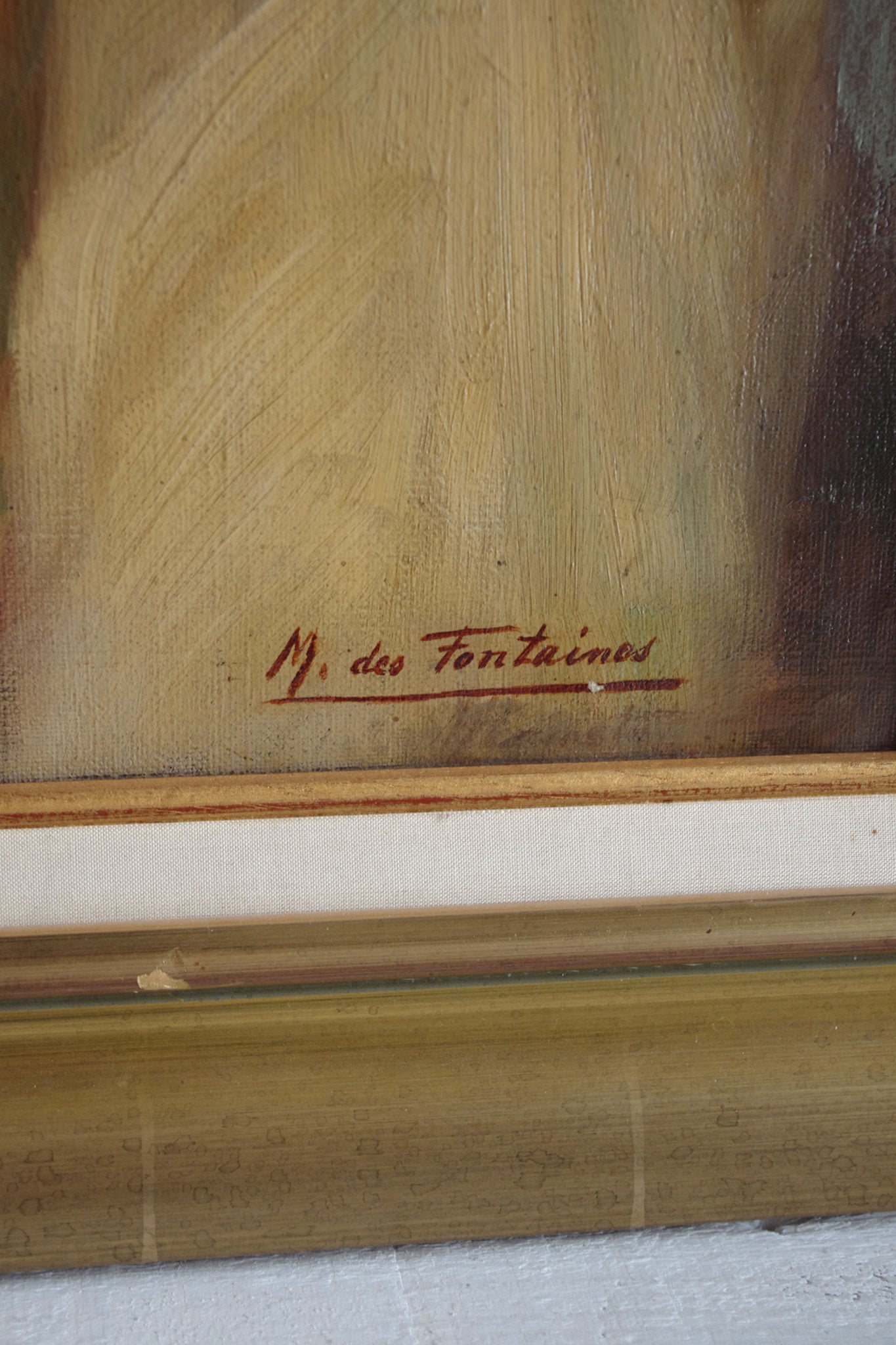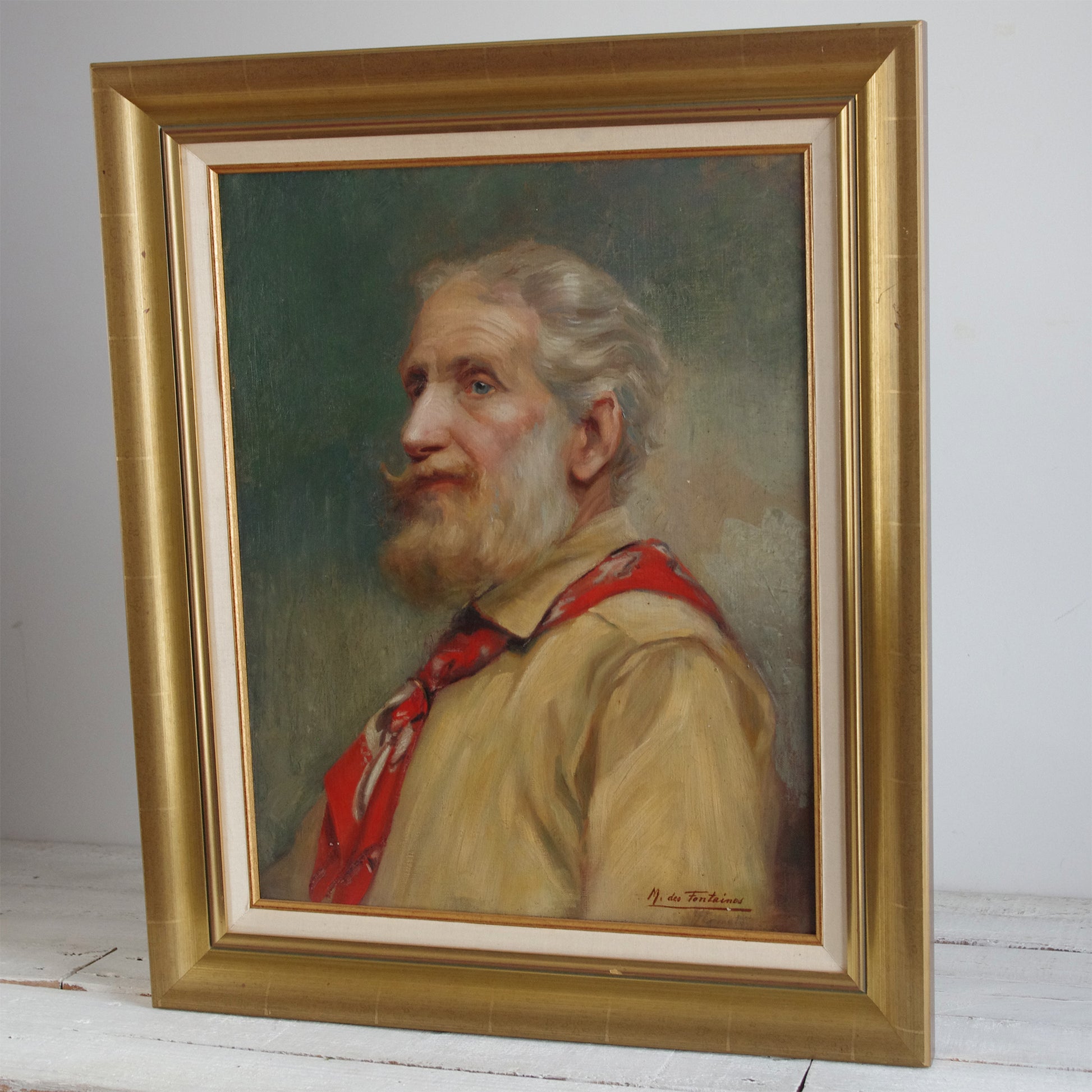 Description: Portrait d’homme barbu aux yeux bleus. Huile sur toile signée en bas à droite “M. des Fontaines”