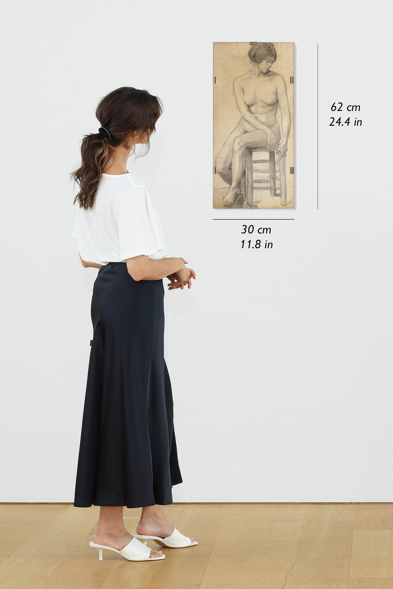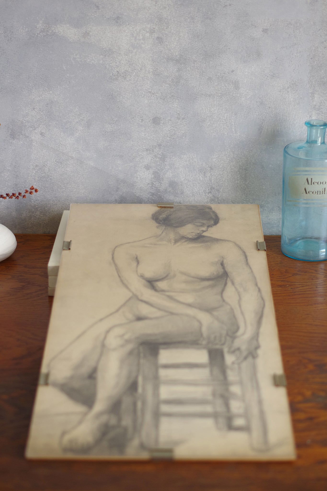 Description: Dessin original au fusain et crayon sur papier. Cette étude de nu représente une femme assise sur un tabouret. Le dessin est protégé par une feuille de plastique, un crochet au dos permet de le suspendre.