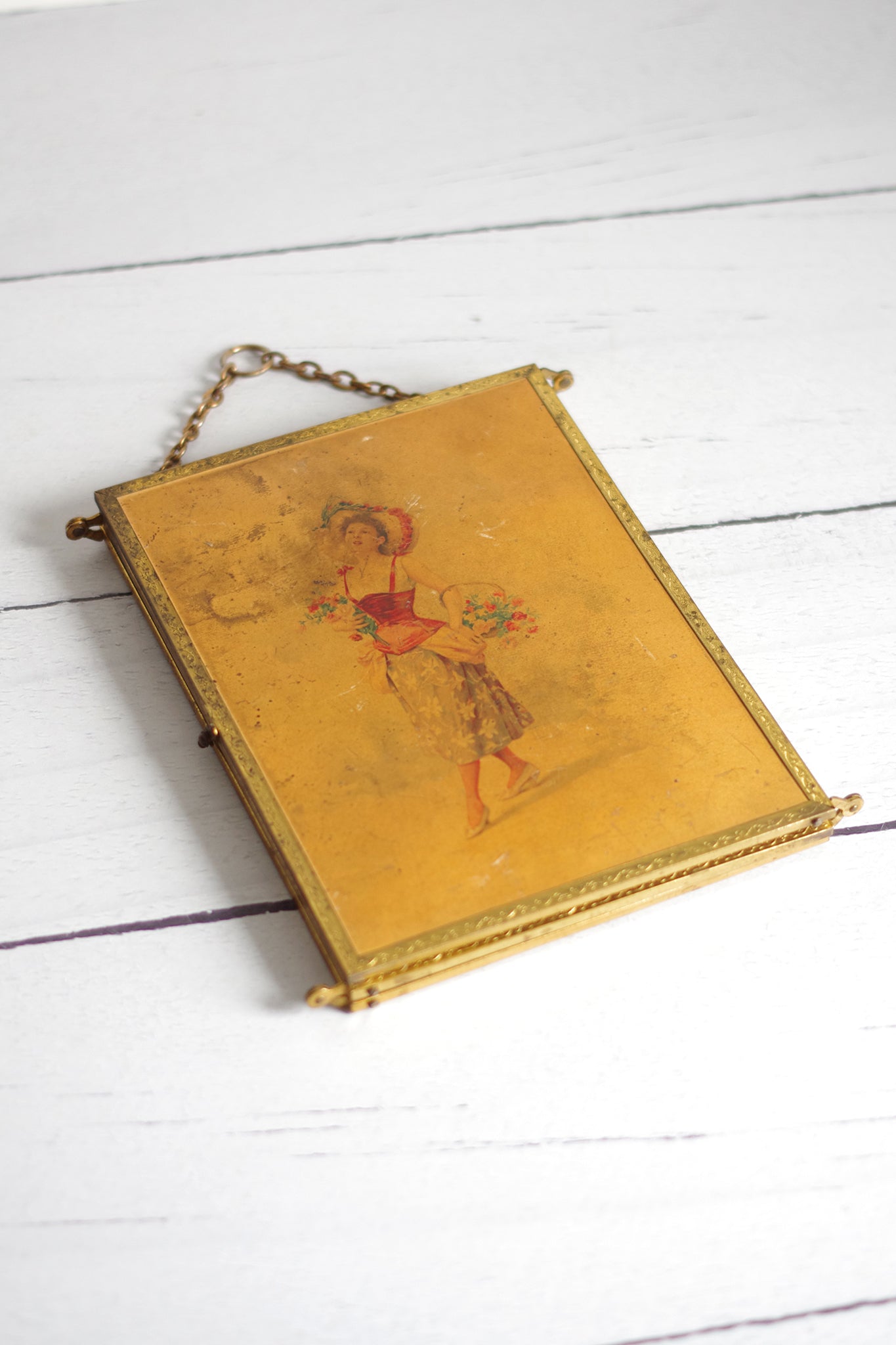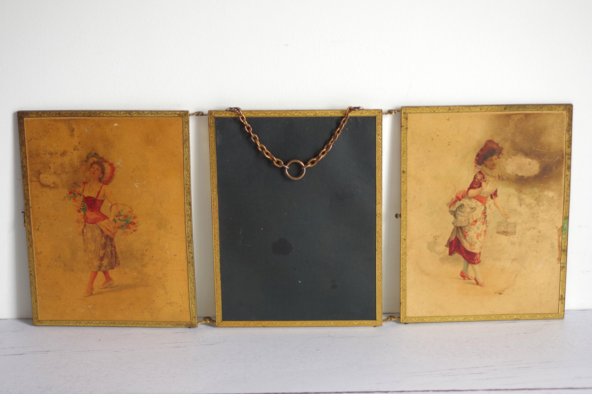 Description: Miroir triptyque dit de barbier ou de voyage de la fin du XIXe siècle. Il dispose d’une chaine pour le suspendre ainsi qu’un fermoir qui fonctionne.