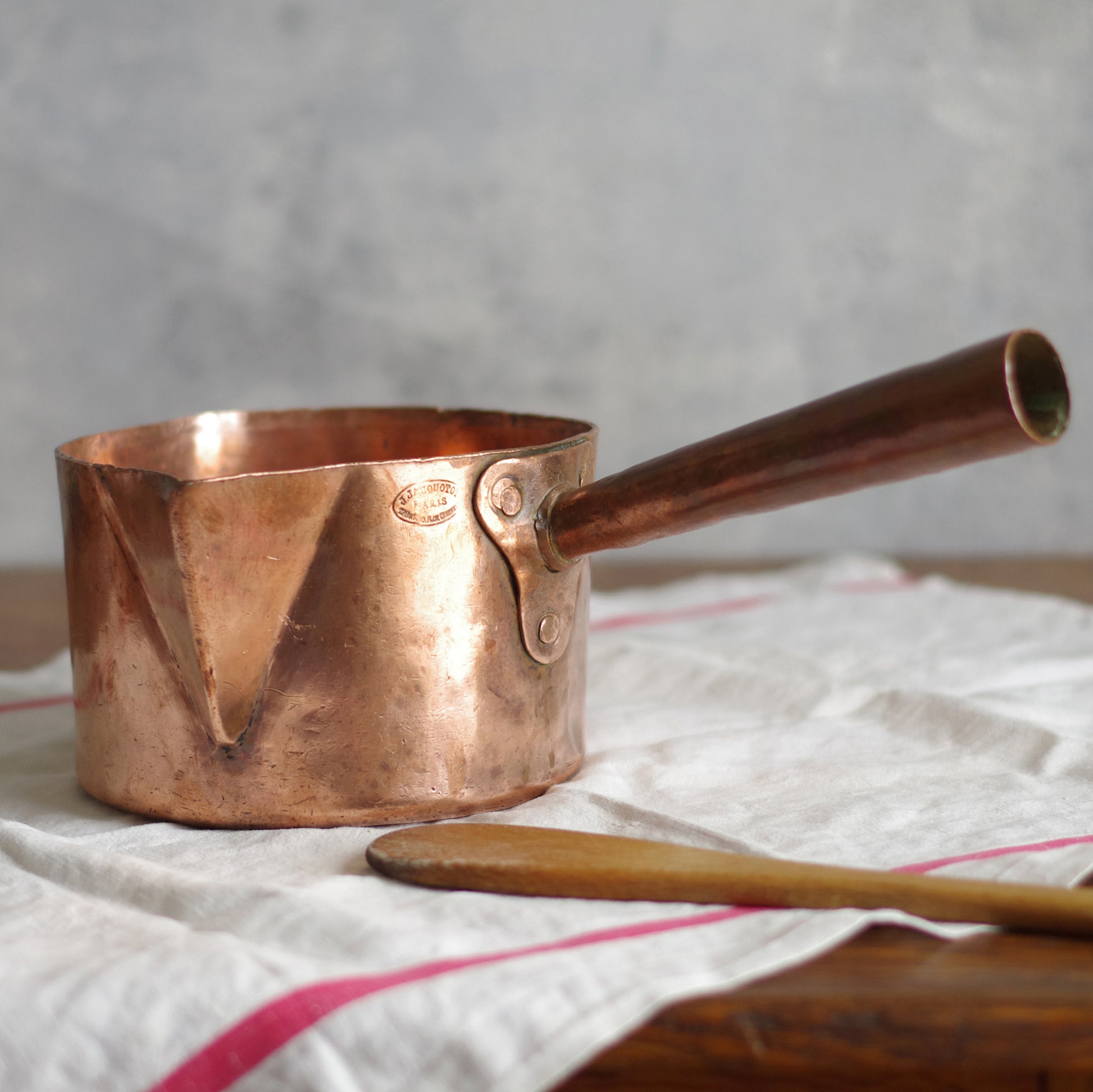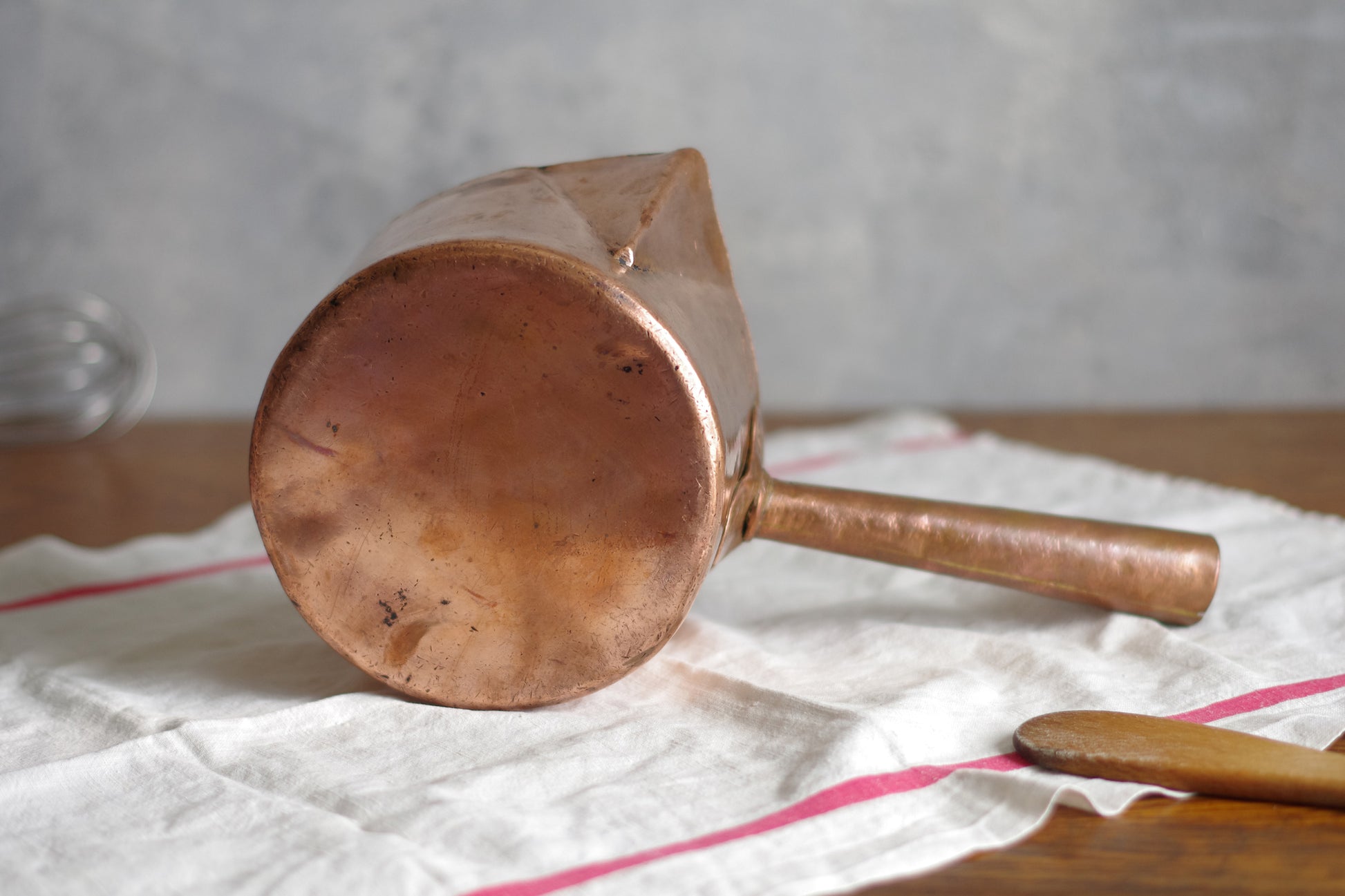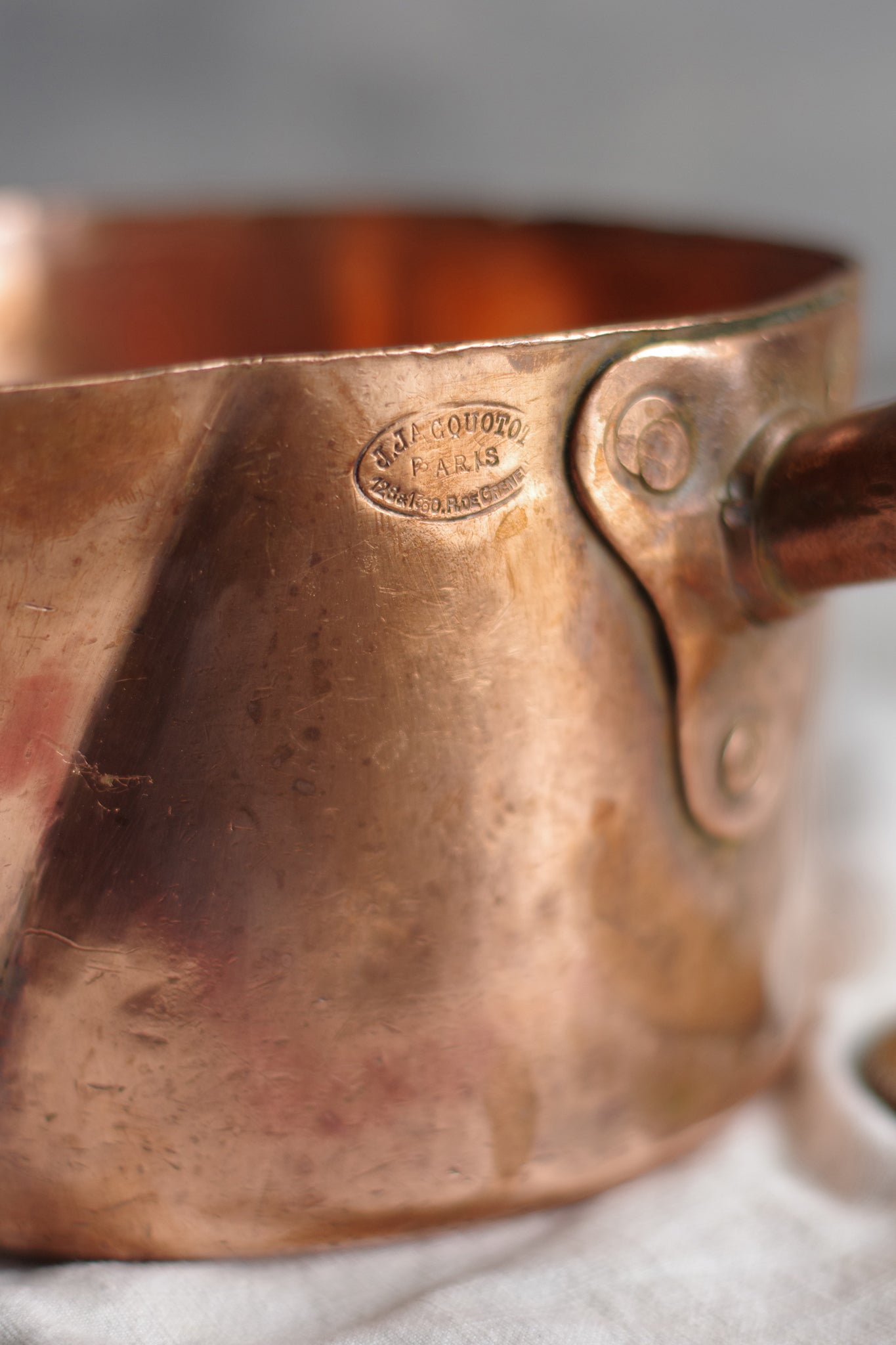 Description: Casserole à caramel en cuivre Jacquotot, un classique des ustensiles de cuisine français anciens. Fabriquée dans les années 1920 et estampillée du nom de J.JACQUOTOT PARIS 12 & 130 R.DE GRENELLE. H.H. est également gravé probablement le nom du chef utilisant cette poêle. L'épaisseur du cuivre est d'environ 2 mm et le manche en cuivre creux est fixé avec trois gros rivets en cuivre. Une pièce unique avec une histoire.