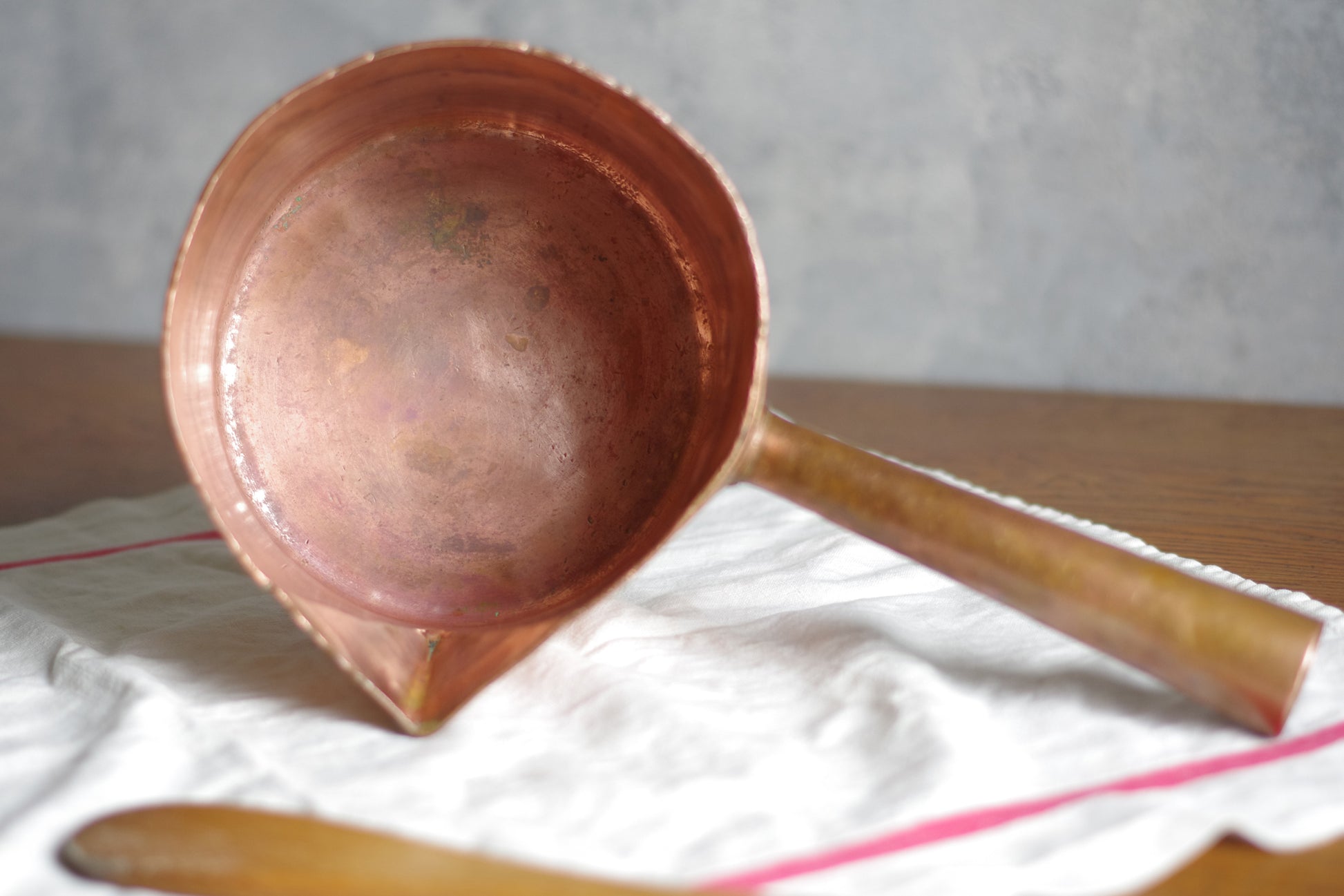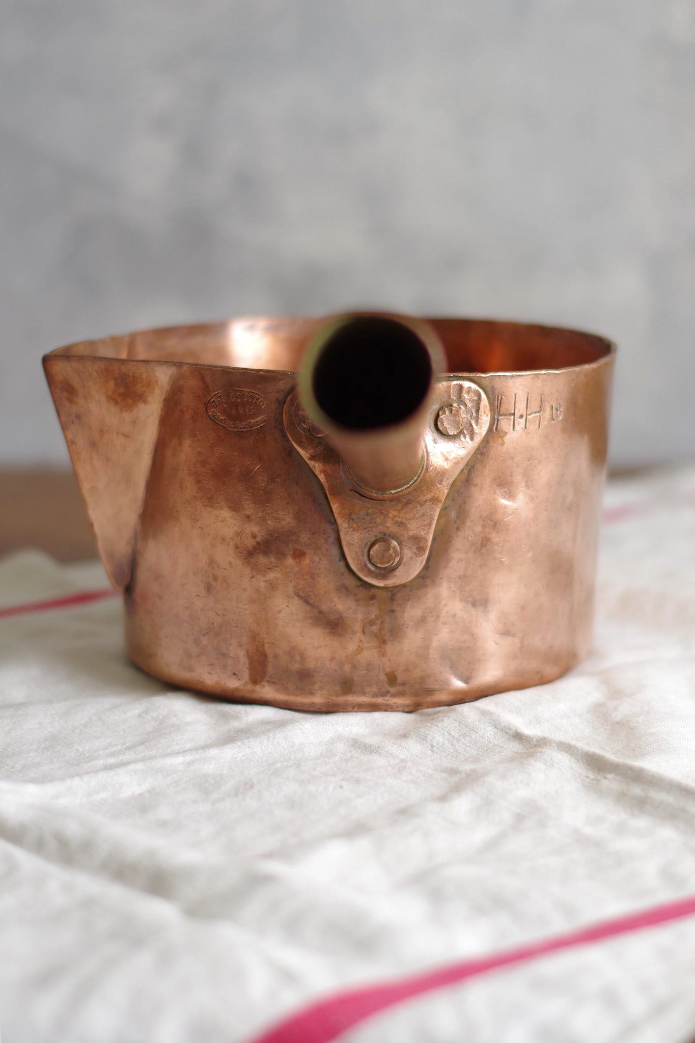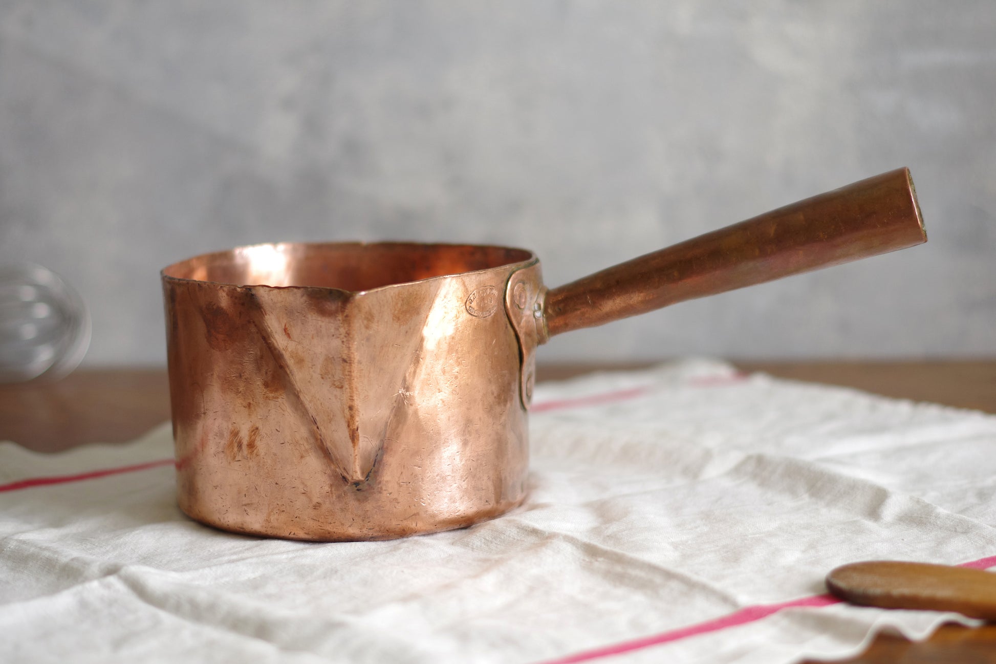 Description: Casserole à caramel en cuivre Jacquotot, un classique des ustensiles de cuisine français anciens. Fabriquée dans les années 1920 et estampillée du nom de J.JACQUOTOT PARIS 12 & 130 R.DE GRENELLE. H.H. est également gravé probablement le nom du chef utilisant cette poêle. L'épaisseur du cuivre est d'environ 2 mm et le manche en cuivre creux est fixé avec trois gros rivets en cuivre. Une pièce unique avec une histoire.