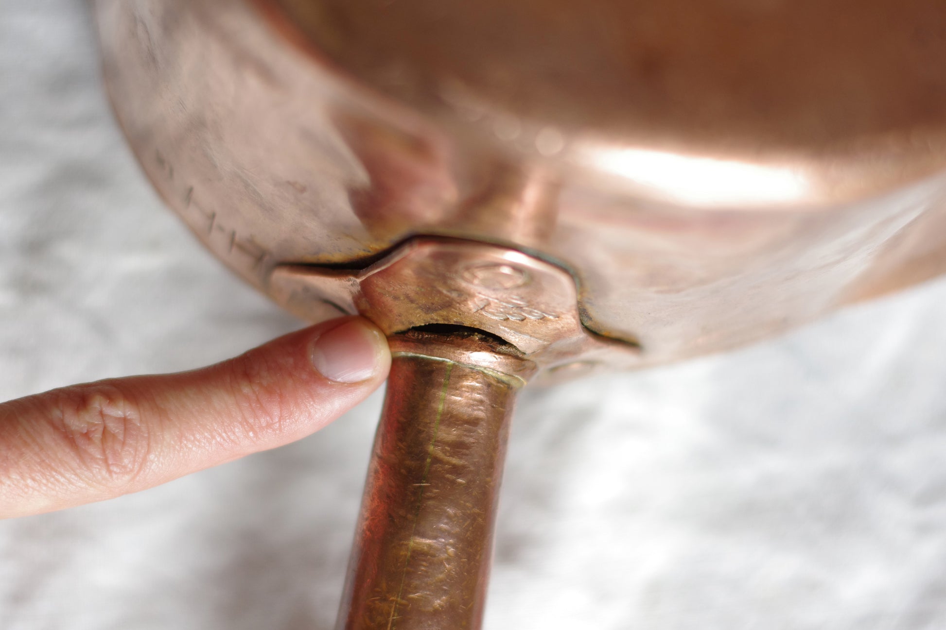 Condition: Bon état antique, une coupure sous la poignée (comme sur la photo) cela reste une construction très solide. Cette casserole a été très utilisée et présente de nombreuses traces d'utilisation.